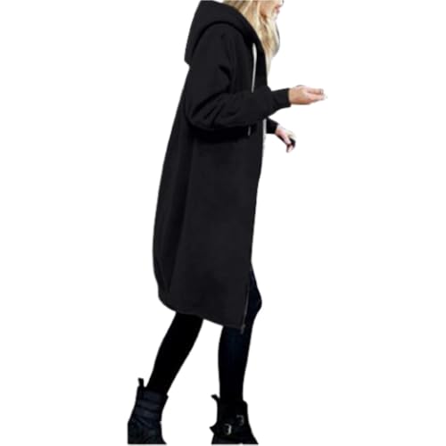 Hoodie dam lång sweatjacka casual bomull huvtröja sport sweatshirt vinterjacka enfärgad elegant huvjacka med dragkedja ficka lös huvtröja jacka rock, B – svart, XXL