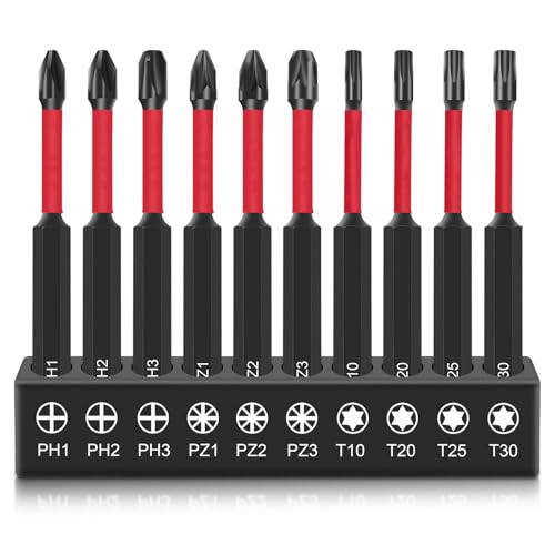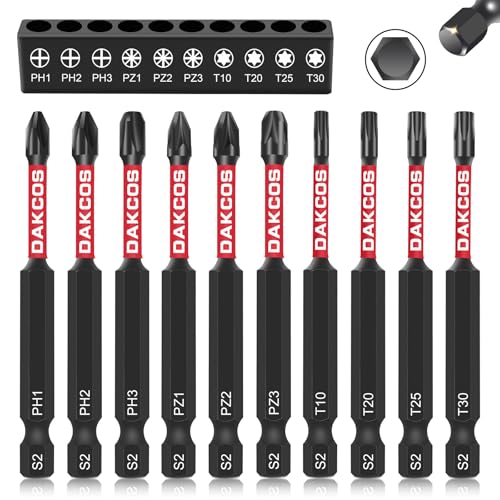 DAKCOS 10-delars 75 mm långa skruvmejselbits, 1/4 tums sexkantig skaft, borr med platt huvud för slagverktyg PH1/PH2/PH3/PZ1/PZ2/PZ3/T10/T20/T25/T30, S2 stål