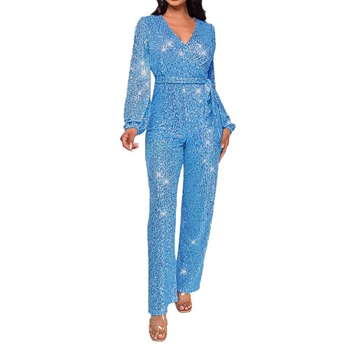 Dam paljett jumpsuit klubbkläder glitter glänsande omlott v-ringad sexig långärmad sparkdräkt raka breda långa byxor dam långärmad overaller elegant, Himmelsblått, M