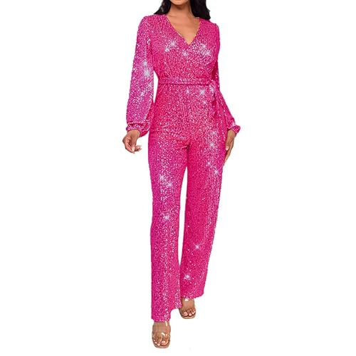 Dam paljett jumpsuit klubbkläder glitter glänsande omlott v-ringad sexig långärmad sparkdräkt raka breda långa byxor dam långärmad overaller elegant, Rosa (Hot Pink), M