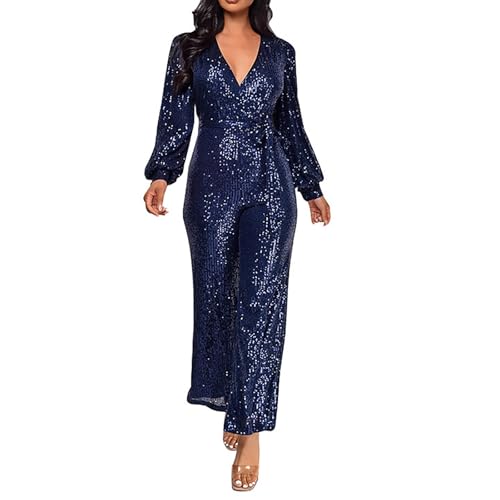 Dam paljett jumpsuit klubbkläder glitter glänsande omlott v-ringad sexig långärmad sparkdräkt raka breda långa byxor dam långärmad overaller elegant, Mörkblått, XL