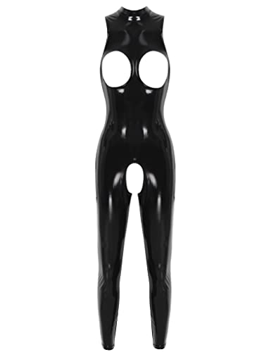 Nyeemya Jumpsuit med Långa Byxor Kvinnor PU Krage Catsuit PVC Bodycon Kostym Playsuit Rompers Ärmlös En Bit Sexiga Kläder, Svart, M