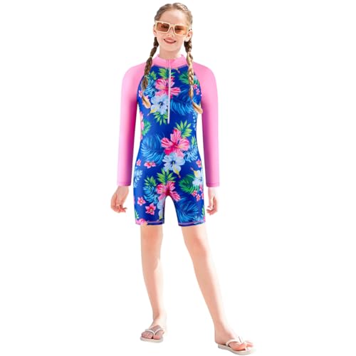 Atorcher Baddräkt för flickor baddräkt utslag gurad baddräkter långärmad badkläder baddräkt hög hals badkläder, Rosa Blommig, 9-10 År