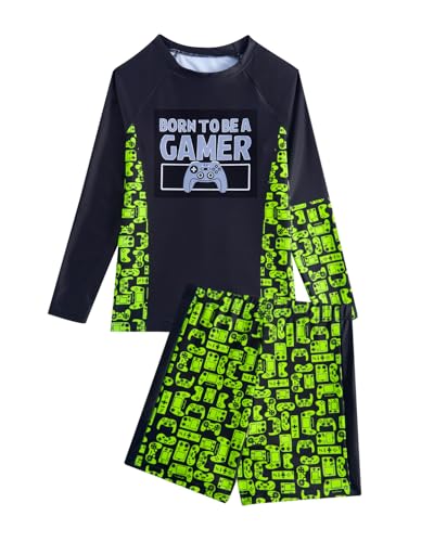 JiAmy pojkar 2-delat badset spel baddräkt långärmad UV utslag skydd tröjor med badbyxor stora pojkar baddräkt för 8-14 år, Grönt spel, 10-11 År