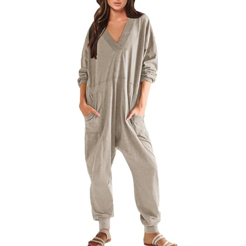Overall dam, mysig oversize jumpsuit, långärmad ledig V-ringad, hemmadräkt, onesie, pyjamasuppsättning, lösa nattskjortor, ledig, onesie sparkdräkt, fritidsoverall, lätt kostym, GRÅ, XL