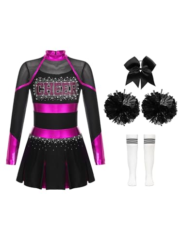 HULIJA Barn flickor cheer leader klänning långärmad cheerleading uniform med poms + strumpor huvudbonad cheer outfits set karneval cosplay, A rosa och vit, 134/140 cm