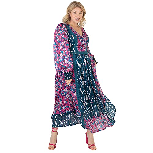 Lovedrobe Dam maxi plus size klänning för damer långärmad blommönster V hals rygg spets manschetter för sommar kontor fest, Rosa, 42 SE