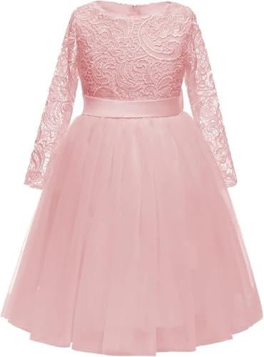 Bascabeen blomsterflicka klänning långärmad spets topp tyllkjol flickor spets festklänningar, En rosa, 10-11 År