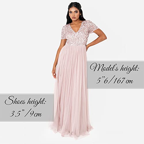 Dam maxiklänning damer utsmyckad wrap tyll luftig V-ringad långärmad för bröllop gäst brudtärna bal klänning, frostad rosa, 16, Frostad rosa, 42 SE