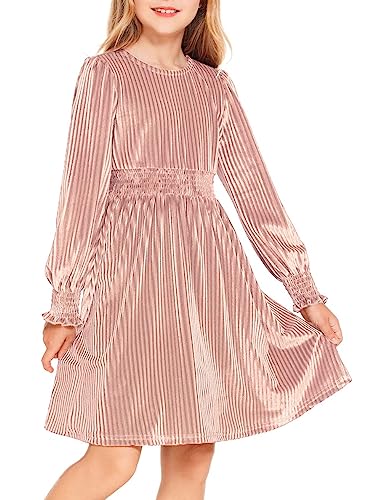 Arshiner Sammetsklänning för flickor långärmad klänning barn ledig klänning enfärgad höst vinter festklänning julklänning vintage festklänning 6–13 år, Rosa, 10-11 år