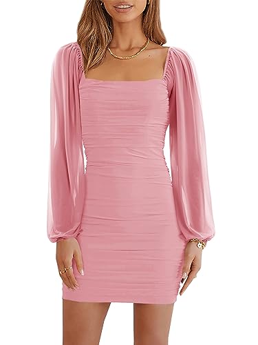 Wenrine Dam Mesh Långärmad Fyrkantig hals Rynkad Party Club Cocktail Bodycon Mini Klänning, Rosa, M