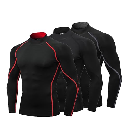 YUSHOW 3-pack herr kompressionströja långärmad funktionell skjorta sportskjorta fitness skjorta löpskjorta andas jogging gym löpning, Svart + svart röd linje + svart grå linje, M