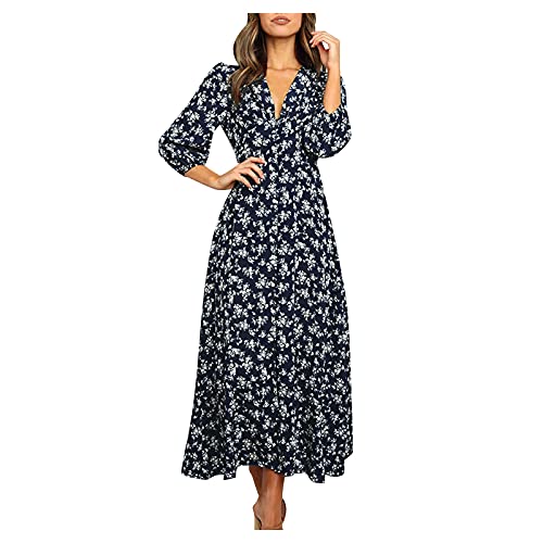 Elegant sommar-/höstklänning för kvinnor, 3/4-ärmar, blommig långklänning, chiffong, veckad, v-ringad omlottklänning, hög midja, volanger, maxiklänning, festklänningar, långärmad A-linjeklänning,
