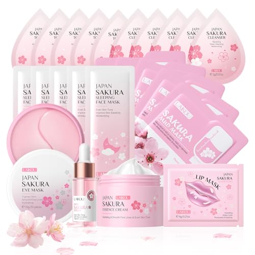 Hudvård för Tonårsflickor, 24 delar Sakura hudvårdsset, Lyxiga kit för kvinnor, Ansiktsvårdspaket – Toner, Rengöring, Ansiktsserum, Kräm, Sovmask, Ögonmask, Lermask, Läppmask