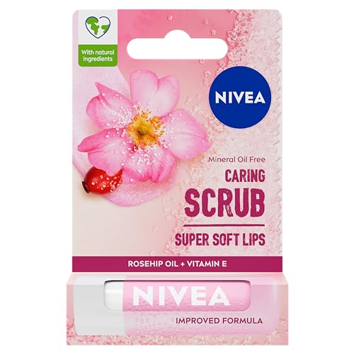 NIVEA 2-i-1 vårdande läppskrubb (4,8 g), läppbalsam med rosenhöftolja och E-vitamin, exfolierar försiktigt för supermjuka läppar, intensiv läppvård, inget behov av att torka av