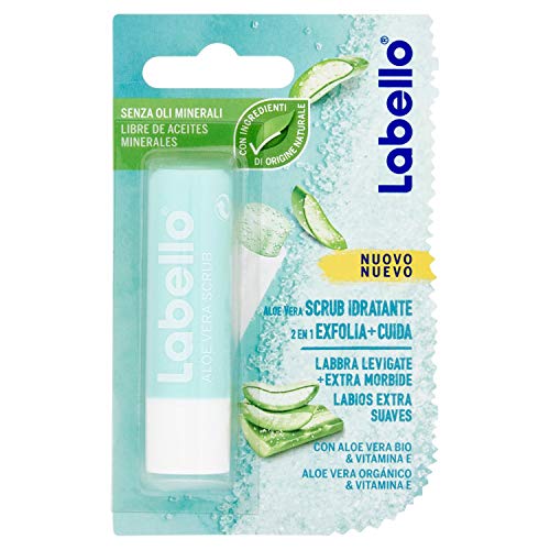 Labello Aloe Vera fuktgivande skrubb 4,8 g, läppskrubb med exfolierande partiklar, bio aloe vera och E-vitamin, exfolierande läppskrubb utan mineraloljor och mikroplast