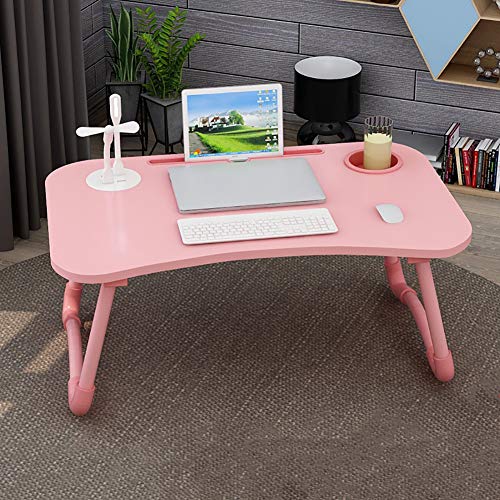 RANHOME Multifunktionellt sängbord för laptop, hopfällbart laptopbord, bärbart sängbricka för laptop, sängbord för laptop med USB/kopphållare och liten present (liten bord, liten fläkt), rosa