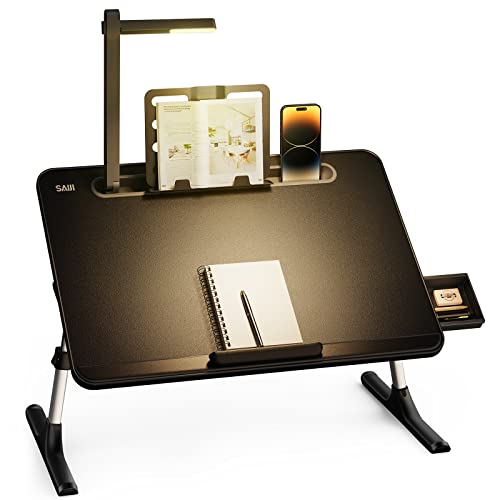 Bord, laptopbord, Saiji sängbord med LED-lampa, justerbar höjd och vinkel, med bokstativ, låda, laptop-stopp, slits för läsplatta, slädben