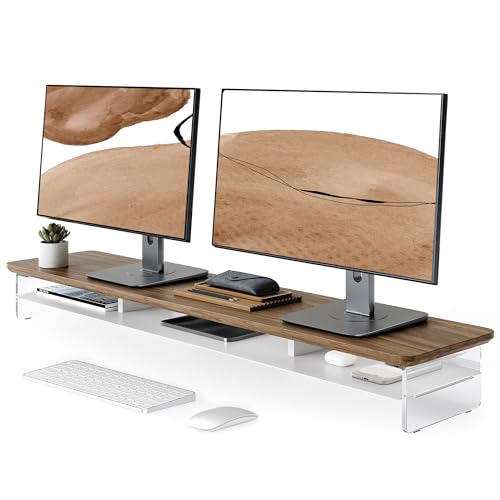 Fenge Akrylmonitorstativ Riser 108 cm, stort dubbelt monitorstativ med metallhylla, skrivbordstillbehör för laptop/PC/skrivare/TV-skärm, lastkapacitet 45 kg brun
