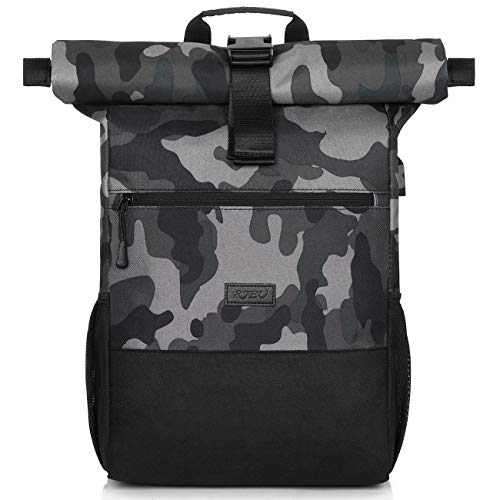 Rolltop-ryggsäck för kvinnor och män, Laptop-ryggsäck för 17,3-tums bärbar dator, Dagsäck vattentät och stöldskydd, skolryggsäck för tonårsflickor och pojkar med USB-laddningsport för arbete, universitet, resor, sportryggsäck (svart kamouflage-26L)