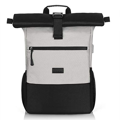 Rolltop-ryggsäck för kvinnor och män, Laptop-ryggsäck för 17,3-tums bärbar dator, dagstät vattentät och stöldskydd, skolryggsäck för tonårsflickor och pojkar med USB-laddningsport för arbete, universitet, resor, sportryggsäck (svart grå-26L)