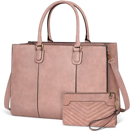 NEWHEY College Väska Kvinnor 40 cm Laptop Arbetsväska Stor Tote med Koppling PU Läder Portfölj Axelväska Skola Messenger Axelväska Kontor Resor Affärer, Retro rosa, L