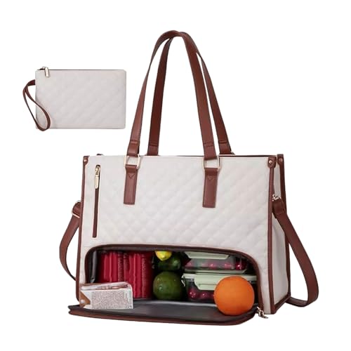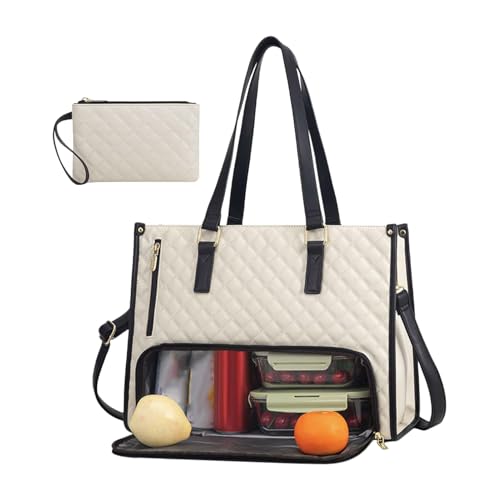 Laptopväska dam med isolerat lunchfack, laptophandväska 15,6 tum, arbetsväska dam, portfölj vattentät, shoppingväska väska läder, axelväska för affärer, krämfärg/vit, Vit, Siehe Beschreibung