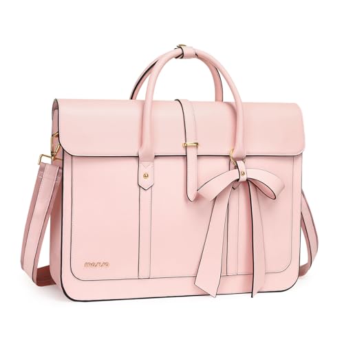 MOSISO Laptopväska för kvinnor, 15–15,6 tum, PU-läder, axelväska, konvertibel ryggsäck, 16 tum, messengerväska, ledig handväska, arbetsportfölj, resväska med rosett, rosa
