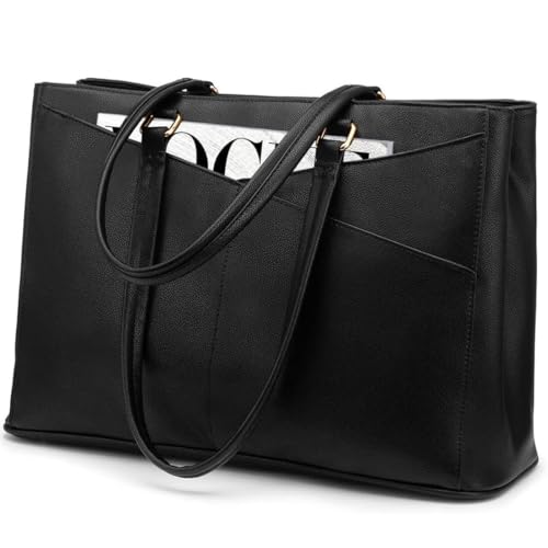 KALIDI Laptopväska dam 15,6 tum handväska stor shopper-väska PU-läder tygväska vattentäta handtag väskor med dragkedja för företag, skola, svart