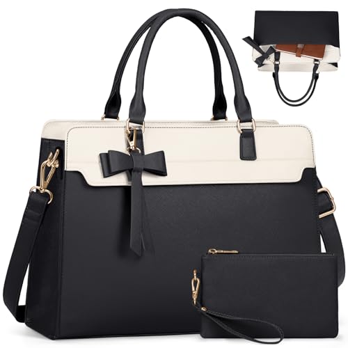 LOVEVOOK Laptop Shopper dam, 15,6 tums laptopväska av konstläder, vattentät handväska, 32 x 13,5 x 42 cm, affärsportfölj med 3 fack, svart, Customs, modern