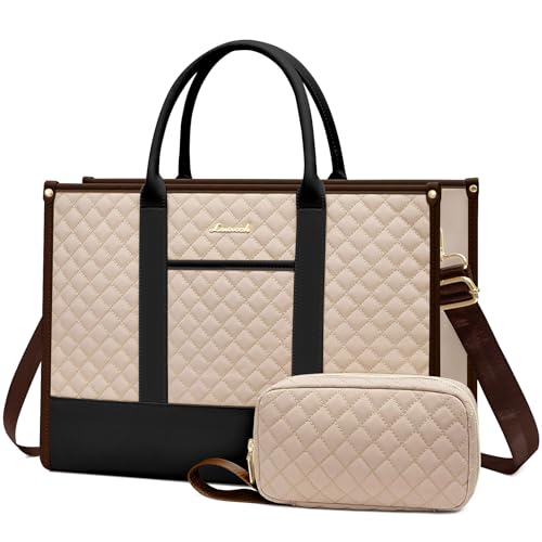 LOVEVOOK Laptopväska dam, vattentät arbetsväska handväska stor skolväska shoppingväska affärsväska portfölj lärarväska, läder bärkasse väska notebookväska för kontor universitet, Svart + beige, 17