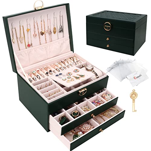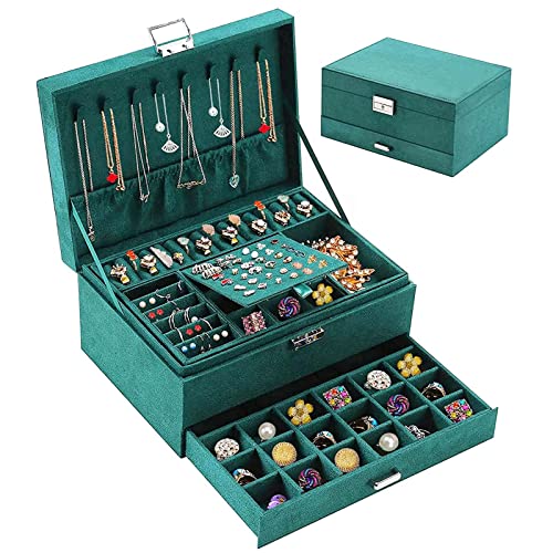 Smyckeskrin, smyckesarrangör med 2 lådor, 3 lager, smyckeförvaringsbox i läder med lås, smyckesförvaringsväska för halsband, örhängen, armband och ringar, mörkgrön