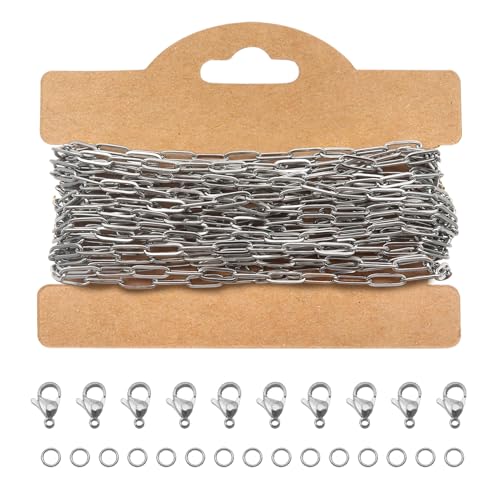 TOAOB Silver 5 m länkkedja 3 mm rostfritt stål kabel metallkedja kedja metervara halsband kedja bulk med 30 hoppringar och 10 karbinhake lås för gör-det-själv-smycken