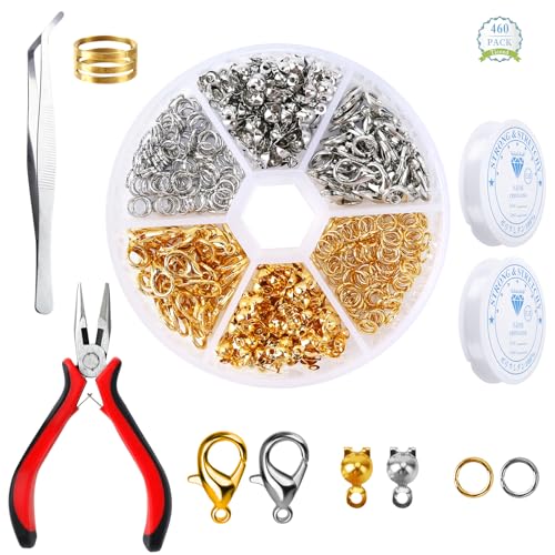 CAUTIOUS 465 st armbandslås med elastisk tråd för armband, smyckesklämma och ring, halsband, klämmor och lås för smycken, nylontråd för armband för smyckestillverkning