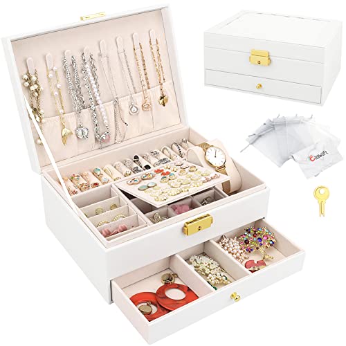 Smyckeskrin, smyckesarrangör med lådor, 2 lager, smyckeförvaringsbox i läder med lås, smyckesförvaringsväska för halsband, örhängen, armband och ringar, vit
