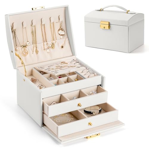 Meerveil Smyckeskrin, smyckeorganisatör, 3 lager PU-läder smyckeförvaringsbox med spegel och lås, för ringar armband örhängen halsband, vit