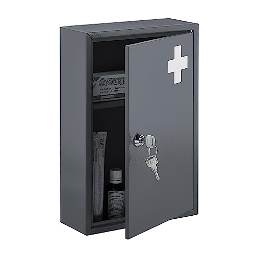 Relaxdays medicinskåp, låsbart, 2 fack, H x B x D 32 x 21,5 x 9,5 cm, väggmontering, första hjälpen, metall, grå/vit, järn