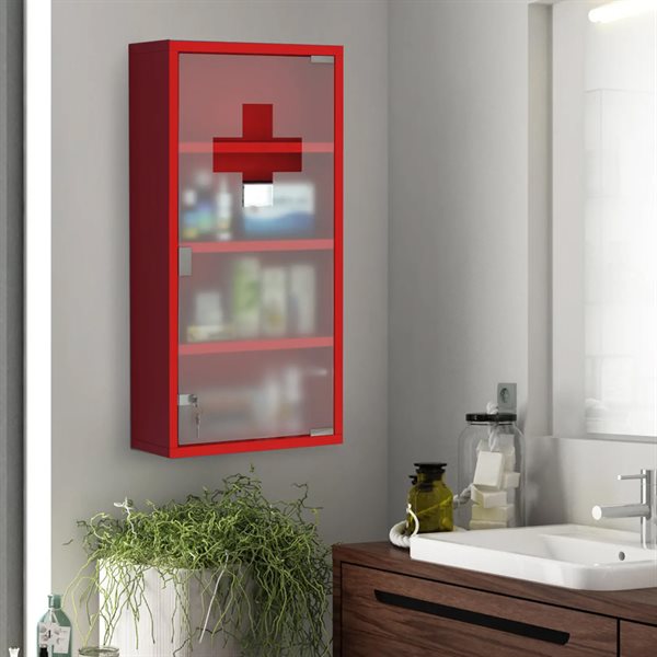 Medicinskåp i stål med frostad glasdörr / låsbart apoteksskåp / väggskåp med 4 hyllor - Röd