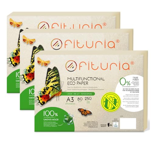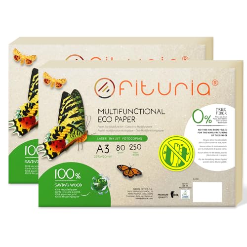Ofituria 80 g A3 Återvunnet Papper - 100% Naturlig Färg - 750 Ark - Lämplig för Laser- och Bläckstråleskrivare
