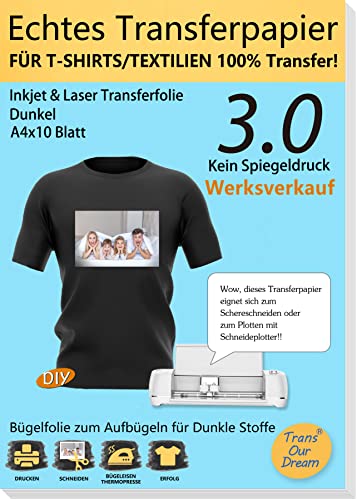 TransOurDream Äkta bläckstråle/laser överföringsfilm, DIN A3 x 10 ark + 1 silikonpapper, textilfolie, strykfolie för mörka textilier, t-shirt papper för laserskrivare/bläckstråleskrivare för mörka