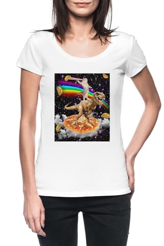 Galaxy Laser Eye Cat På Dinosaurie På Pizza Med Tacos Vit T-Shirt För Kvinnor Med Kort Ärm Women's White T-shirt