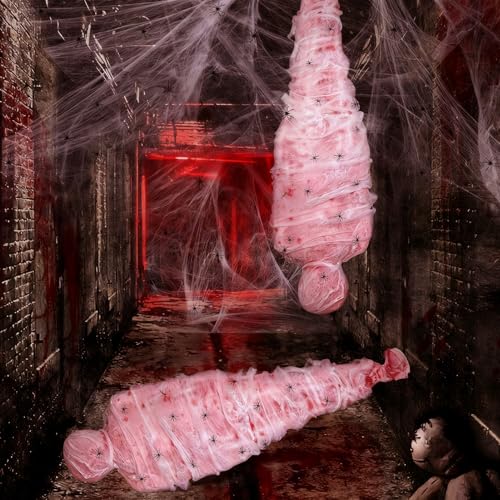 Forbabe 2 uppsättningar halloween falska likrekvisita, läskig halloweendekoration hängande lätt kroppspåse med 150 cm uppblåsbar docka naturlig storlek blodig duka/bandage spindelnät spindel luftpump