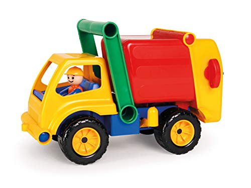 Lena 04356 aktiv sopbil lastbil, sopfordon ca 30 cm, robust sopbil med låsbar sopbehållare, 1 soptunna och rörlig lekfigur i lekset, leksaksfordon för barn från 2 år, gul/röd