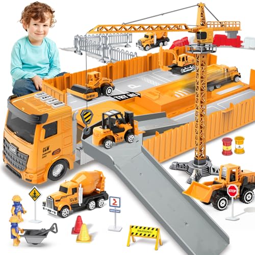 deAO Byggbilsset med lastbil, bulldozer, traktor, gaffeltruckar, mixer, grävmaskin, kran och tippbil - bra present