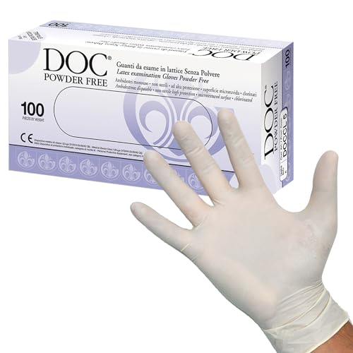 DOC – latexhandskar, tvåhändiga, med fåll, pulverfri, storlek medium, förpackad i dispenserlåda med 100 enkla handskar