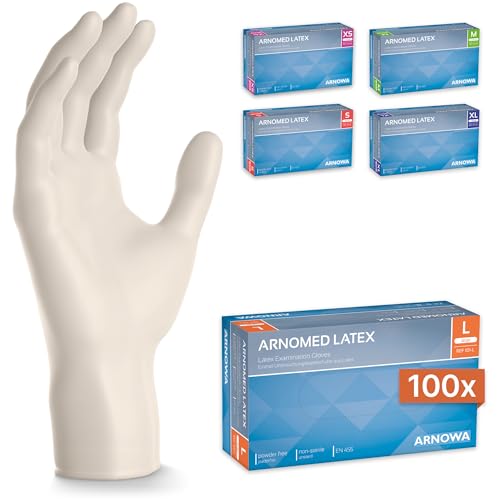 ARNOMED Latex engångshandskar L, vita, puderfria, 100 st/ask, engångshandskar i latex, latexhandskar finns i storlekarna XS, S, M, L & XL.