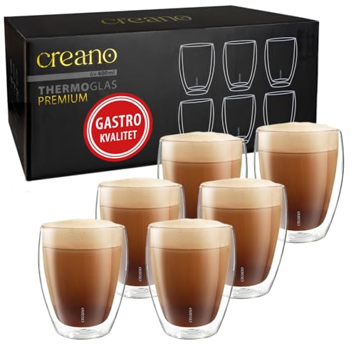 Creano PREMIUM dubbelväggiga dricksglas 400 ml – uppsättning om 6 – gastronomikvalitet – 100 % diskmaskinssäker – nyhet 2024 – dubbelväggiga glas – latte glas – cappucinokoppar