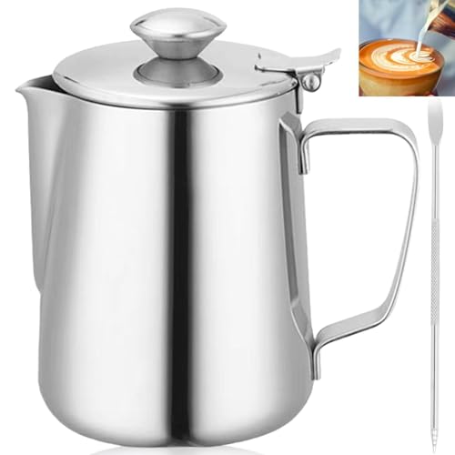 GOMETY 350 ml rostfritt stål mjölkkanna med lock, mjölkkanna kaffe kanna mjölkskummare gräddkanna mjölkskumkanna kaffe barista tillbehör med kaffe-latté-konstnål för cappuccino (350 ml)