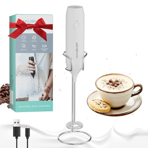 HAUSHOF Mjölkskummare stång, uppladdningsbar handhållen mjölkskummare, med visp av rostfritt stål, med stativ, med USB-laddningskabel, lätt att använda för kaffe, cappuccino, latte, vit