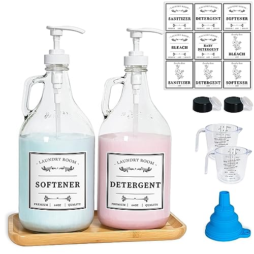 LIKAJON Glass Laundry Detergent Dispenser, Liquid Laundry Soap Dispenser for Laundry Room, 64oz Detergent Bleach Softener Dispenser for Farmhouse Decor, Includes Pumps, Funnel, Labels and Bamboo Tray